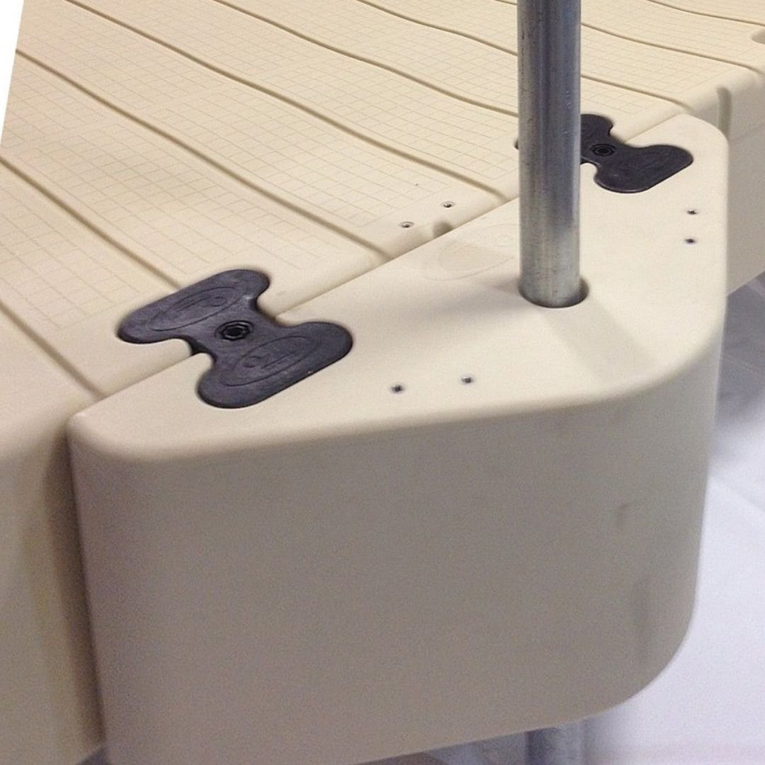 Heavy-duty polyethylene pipe bracket allows docks to adjust to changing water levels. Hole opening for pipe is 3.5" which we typically use with 2 3/8" OD Galv Pipe. (includes 2ea. rubber coupler sets)