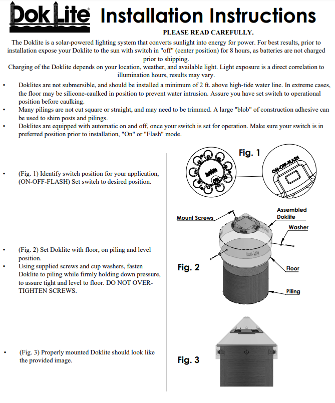 DokLites are the world’s most functional dock lighting system available. It’s technology has multiple patents and brings a new era in lighting for docks, decks, and waterway obstructions. With a solar power design, all DokLites are maintenance free, and eliminate the need for any future electrical work on your dock.